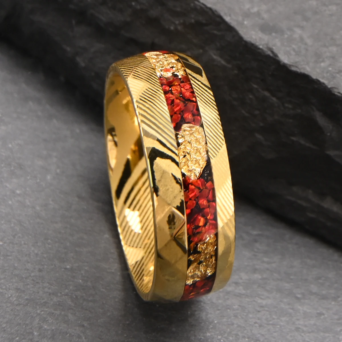 Het geometrische patroon geeft een moderne draai aan traditionele trouwringen, waardoor het een unieke keuze is voor koppels.